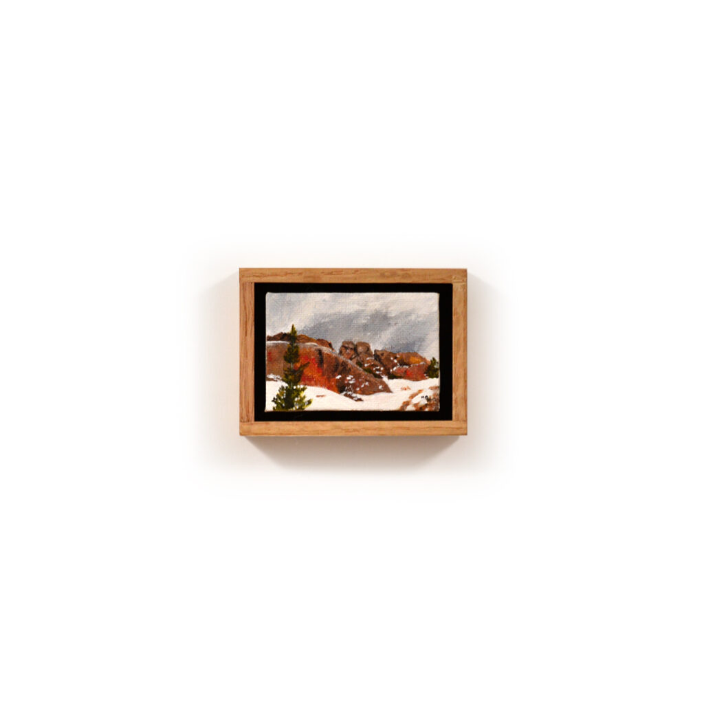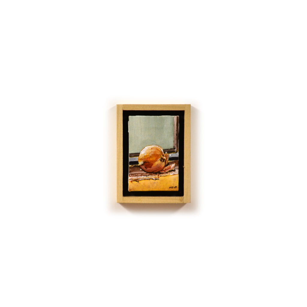 Onion I, 2025, acrylic on canvas, handmade frame, 2 x 3 inOnion II, 2025, acrylic on canvas, handmade frame, 2 x 3 inOnion III, 2025, acrylic on canvas, handmade frame, 2 x 3 inSpideog Mhucrois, 2025, acrylic on canvas, handmade frame, 2.5 x 2.5 inBarn, 2025, acrylic on canvas, handmade frame, 2.5 x 2.5 inPut the Biscuit in the Basket, 2025, acrylic on canvas, handmade frame, 2.5 x 2.5 inHorsetooth Winter III, 2025, acrylic on canvas, handmade frame, 3 x 2 in